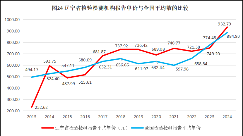 由图24可见,除了2013年、2015年、2016年和2023年等少数年份,其余年份辽宁省检验检测报告的单价高于全国平均水平,不过差别并不大。2024年,辽宁省检验检测机构的报告单价为932.79元,略高于全国平均数。总体来说,辽宁省检验检测报告单价与全国平均数接近,在出具报告数量不大的情况下,单价也没有太多优势,可以推断辽宁省检验检测机构的利润空间很小,会影响到检验检测机构的发展动能。